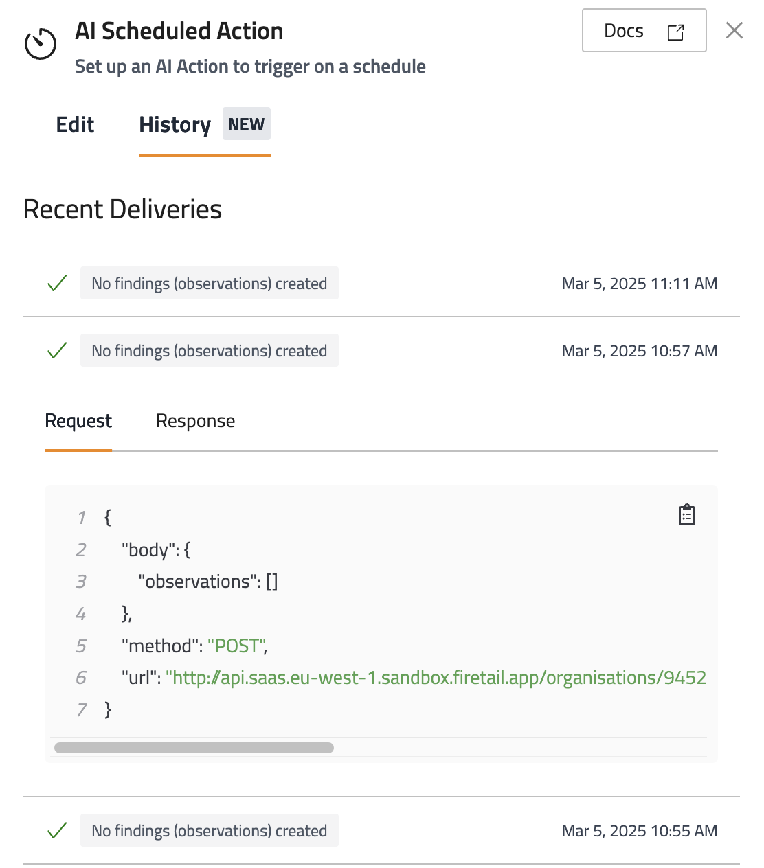 The Actions history lets you view the execution logs of your actions. You can inspect request and response payloads, see how many findings were generated, and review any error messages returned by your integration.