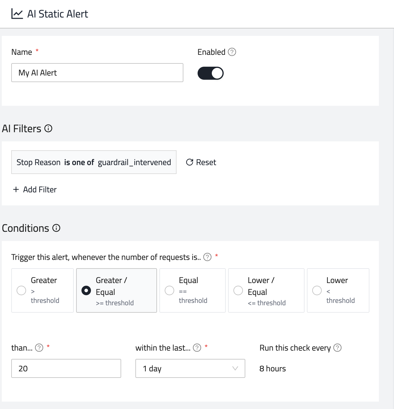 AI Filters - Apply filters to define what should be monitored by the alert.