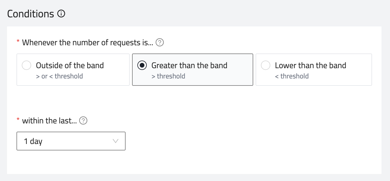 - Lower than the band - Triggers an alert when the request data falls below the lower limit of the normal range.