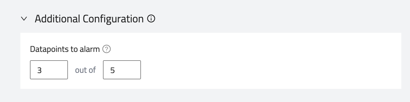 Define the number of data points within the evaluation period that must be anomalous to trigger an alert. This allows you to specify how many breaching data points (non-consecutive) are needed to trigger an alarm. Example: If you select 3 out of 5 data points, the alert will trigger if at least 3 of the last 5 evaluation periods show anomalous data.