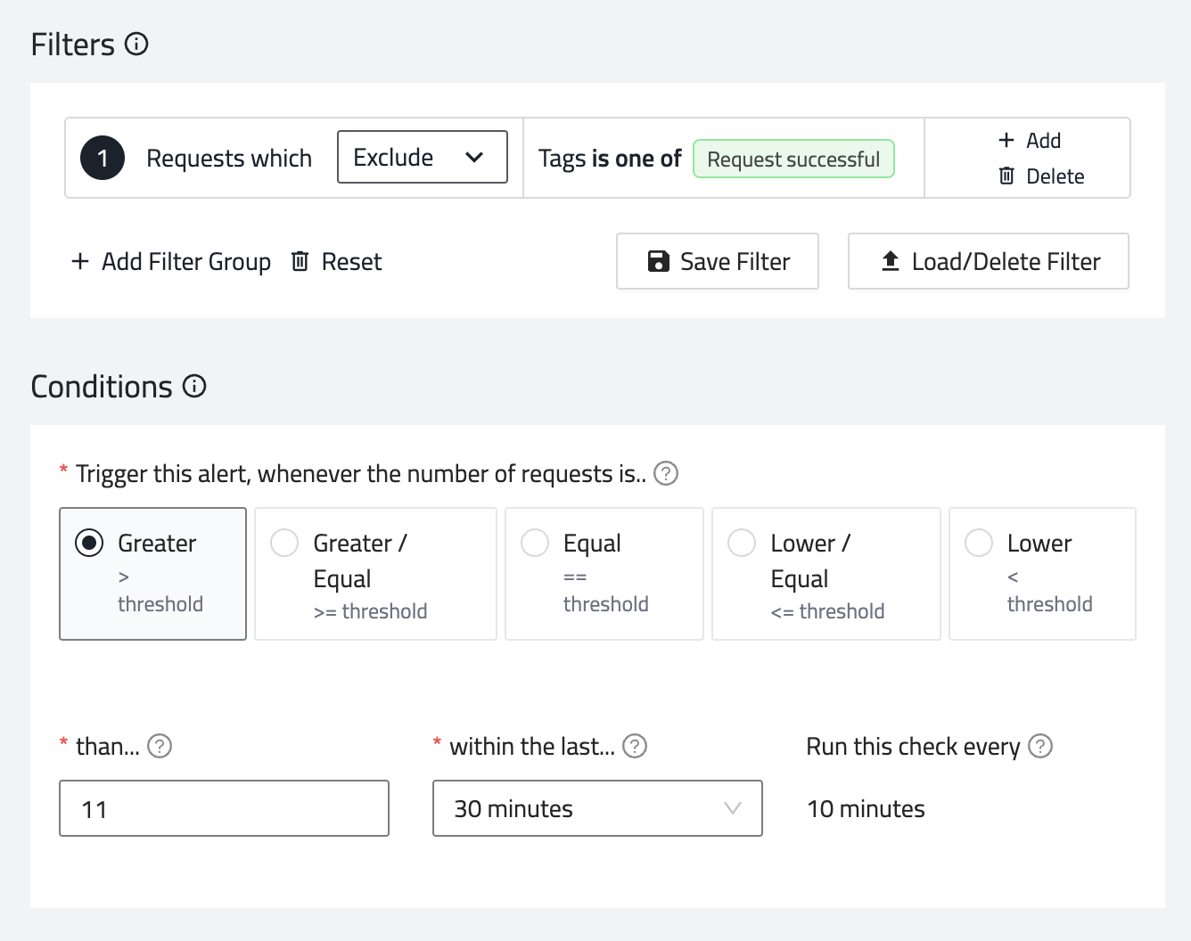 - Within the last - This is the time period during which the requests are evaluated for the alert condition. Select the value from the dropdown. The frequency of the alert checks is calculated as a period divided by three. For example, if you select 6 hours, then an alert check is run every two hours and that alert check evaluates the previous 6 hours. This is displayed under the Runs this check every field.
