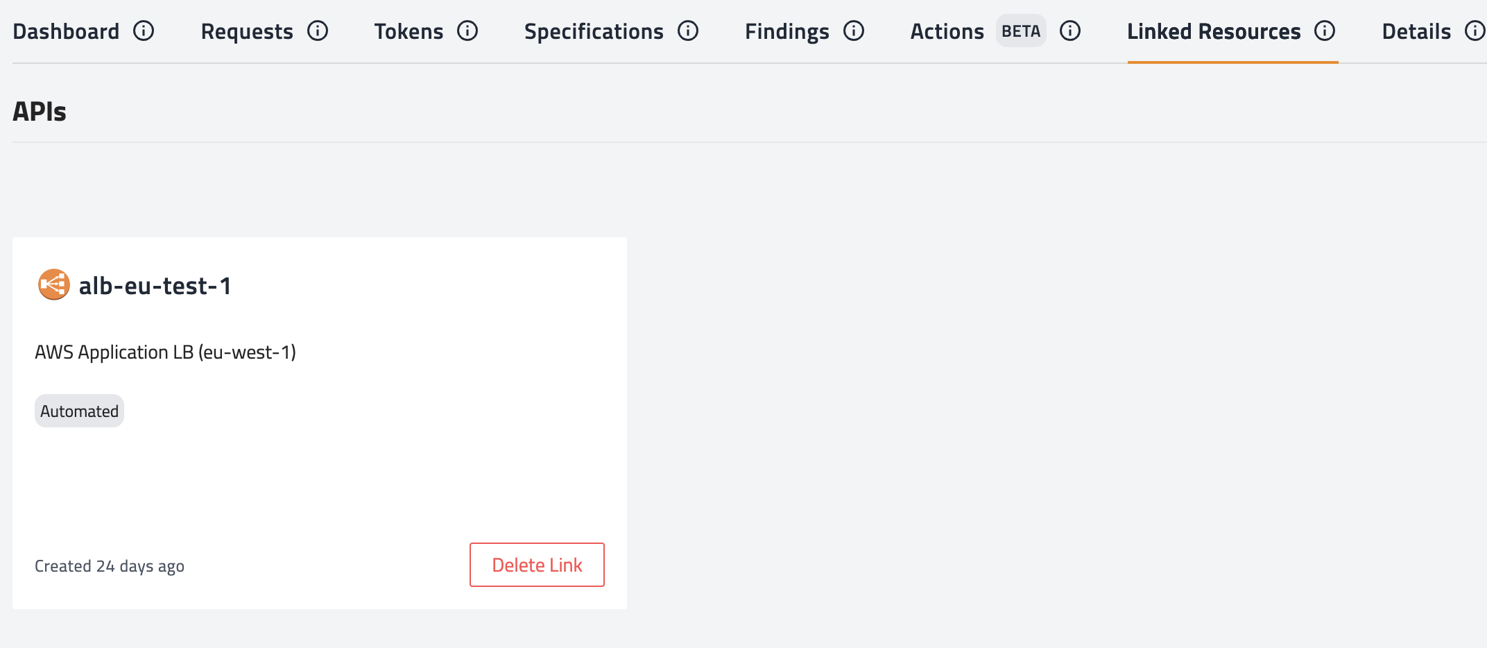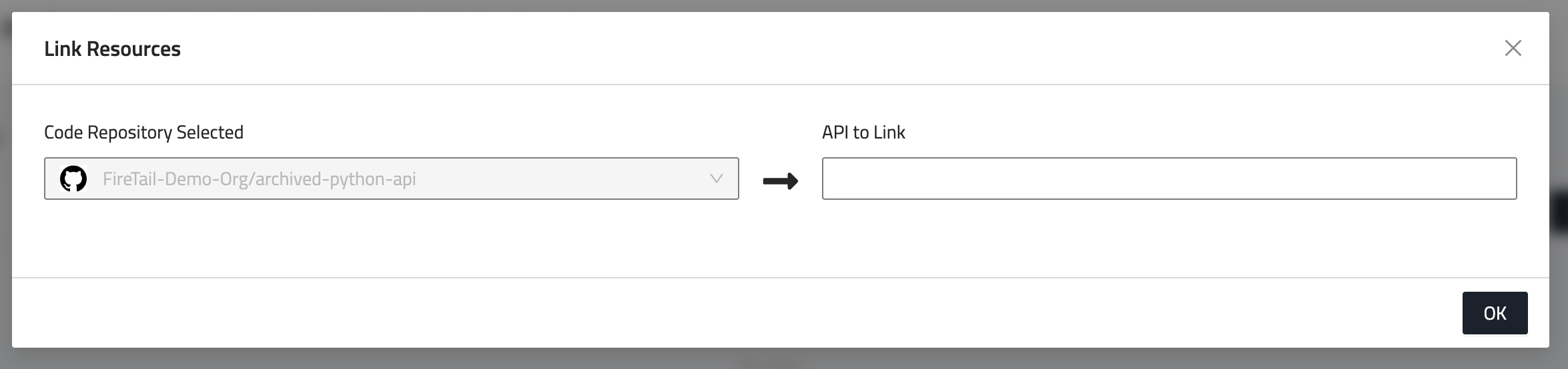 Linked Resources can be connected to code repositories with APIs either manually or automatically. When done automatically, the system scans the code to find and link relevant resources in the background. For manual setup, you can click Create Link and select the appropriate code repository or API. FireTail identifies the correct cloud API corresponding to the one in the code and creates a linked resource between them