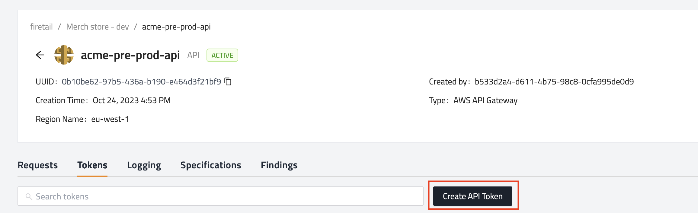 - Navigate to Inventory and select APIs in the FireTail platform. Select the API you want to create an API token for.
