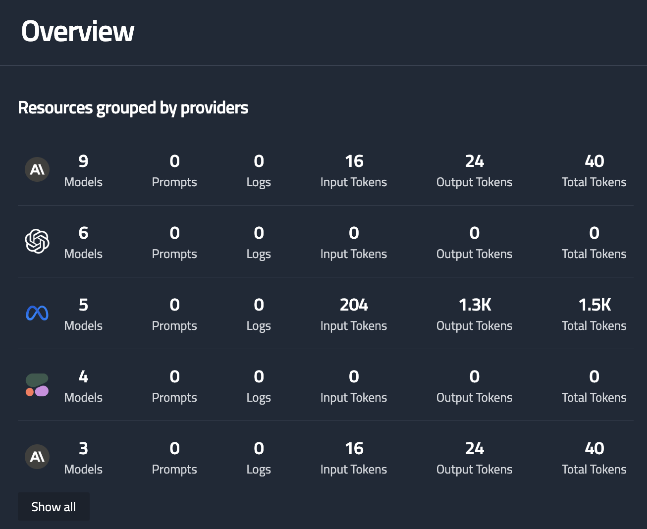 This section organizes AI resources by provider (for example, OpenAI, Cohere, Amazon, Anthropic) and displays: