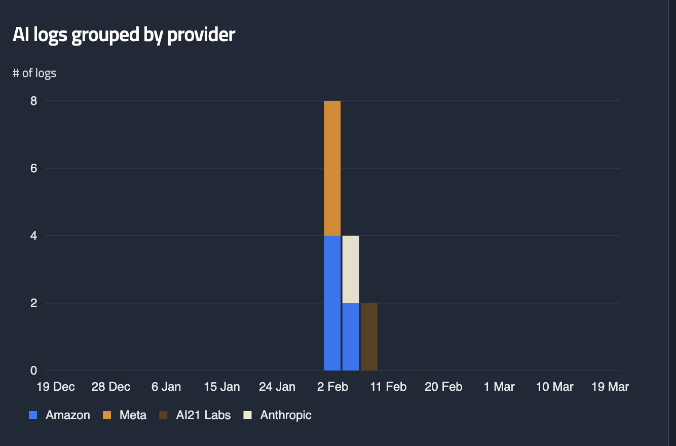 A chart displaying the number of logs generated by each AI service over the selected time period. Hover over the chart to see a breakdown of logs per provider for each day.