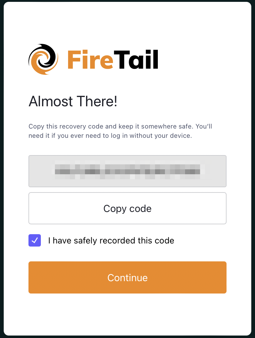 A recovery code is generated. Copy the code and store it somewhere safe (for example, a password manager).