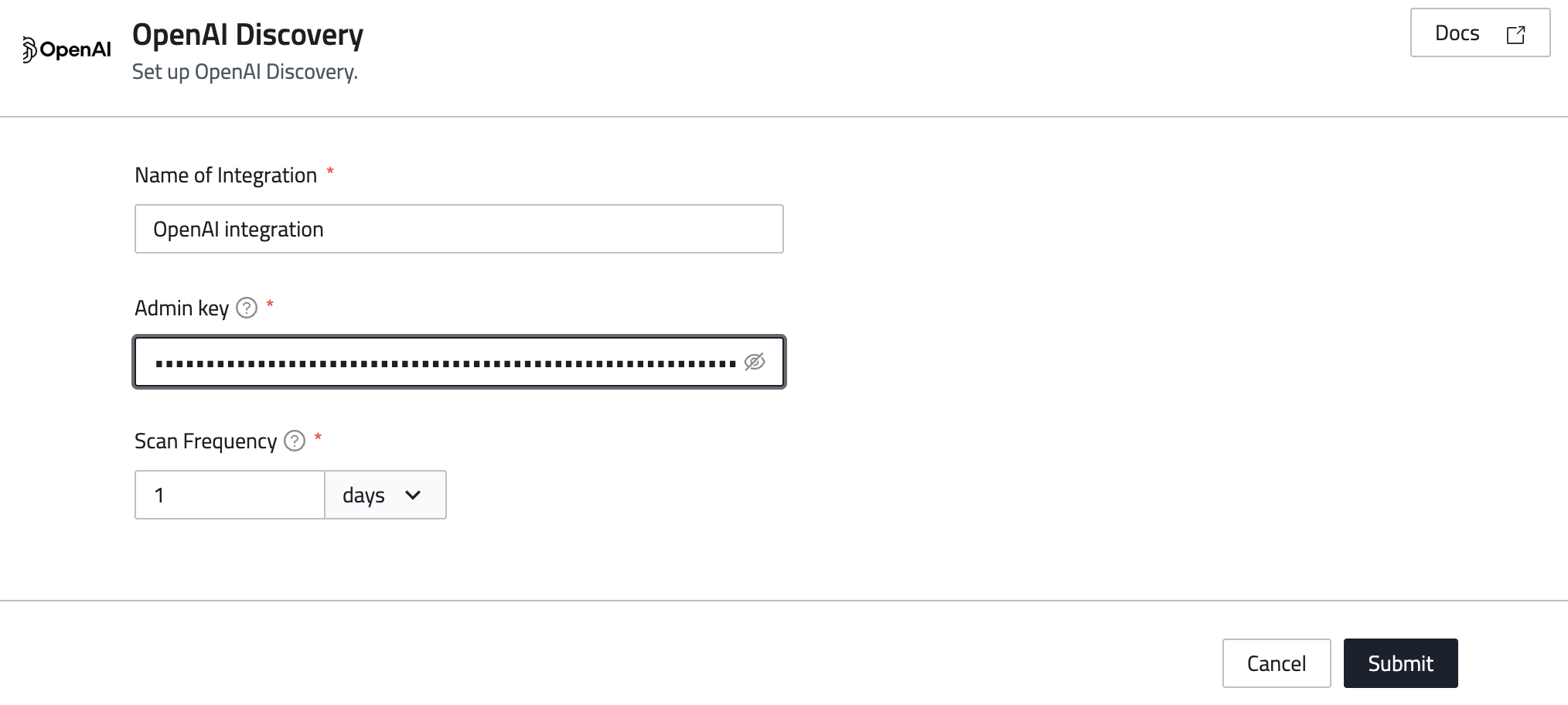Set up an integration with OpenAI. This integration will discover AI models by usage. To create the integration, you must have an admin key generated in OpenAI. Follow the steps below to generate the admin key: