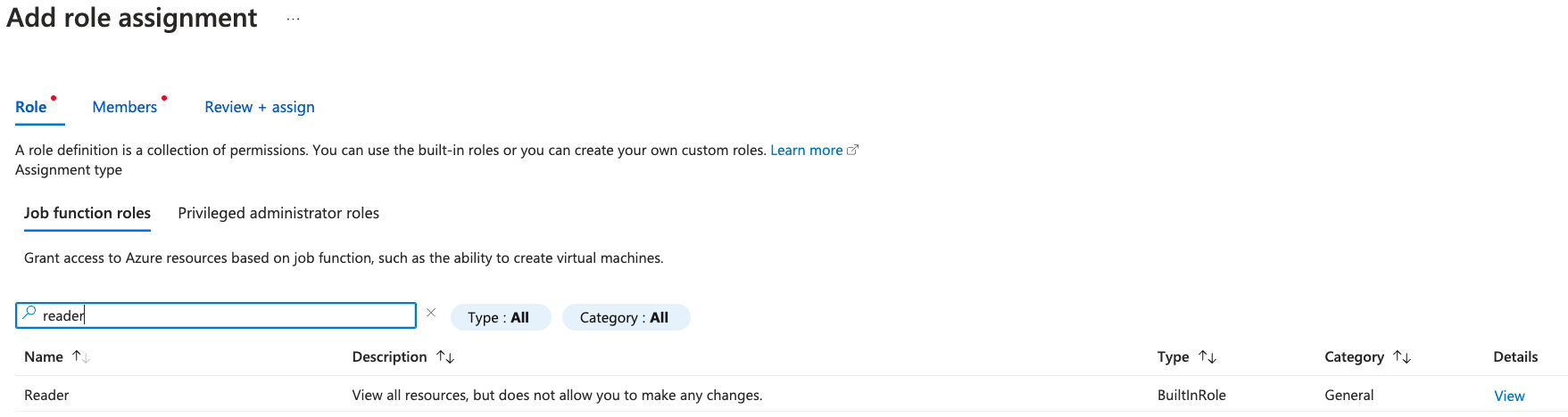 In the Roles tab, search for and select the Reader role.