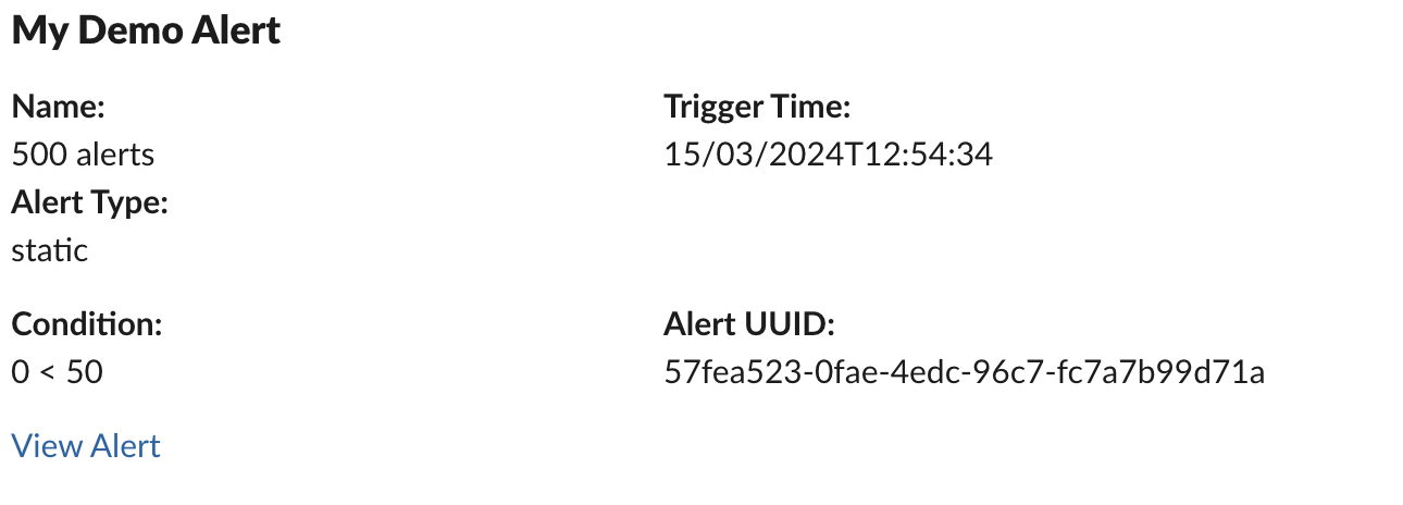 When triggered, this payload will send an alert to Slack that includes the alert name, trigger time, and condition, along with a link to view more details.