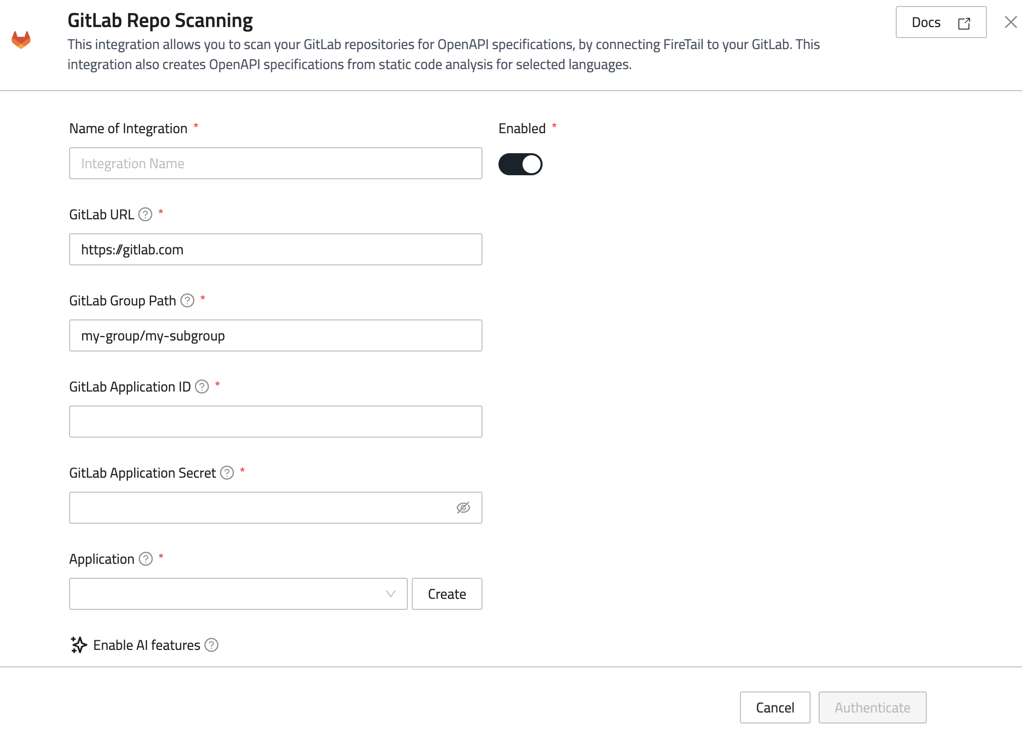 This integration allows you to scan your GitLab repositories for OpenAPI specifications, AI models, and prompts by connecting FireTail to your GitLab. It also generates OpenAPI specifications from static code analysis for selected languages.