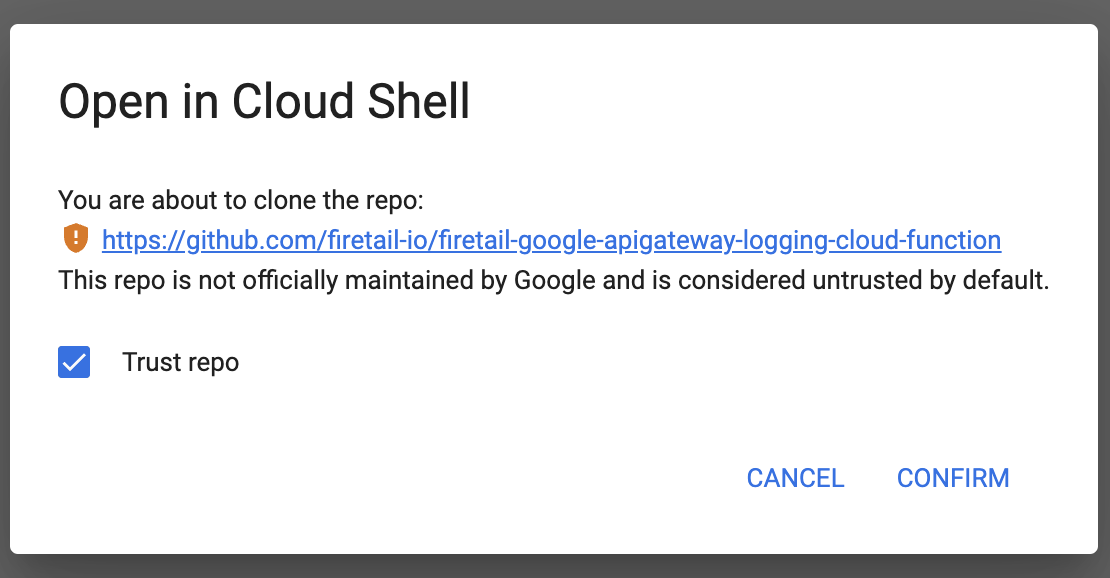 Go to https://ssh.cloud.google.com/cloudshell/editor?cloudshell_git_repo=https://github.com/firetail-io/firetail-google-apigateway-logging-cloud-function. You will need to indicate that you trust the repo.