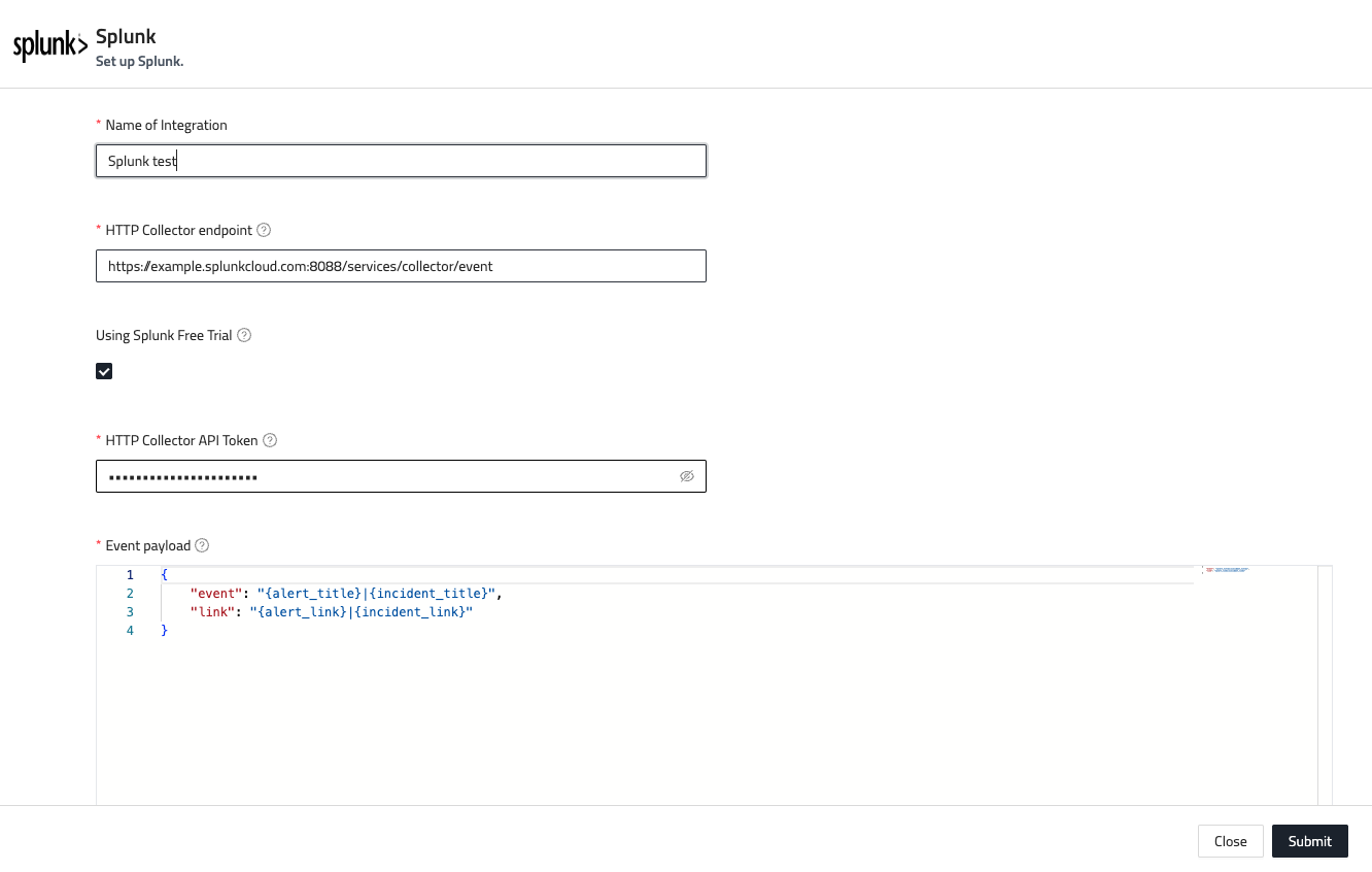 - In FireTail, edit the payload if required. This is the information that is populated in the Splunk when an alert or incident is triggered. Tokens, which are placeholders embedded in the payload, dynamically insert relevant data such as alert details, timestamps and so on. You can edit these tokens to customize the information displayed in the notification. For a full list of tokens, go to Dynamic variables. Learn how to Customize notifications.