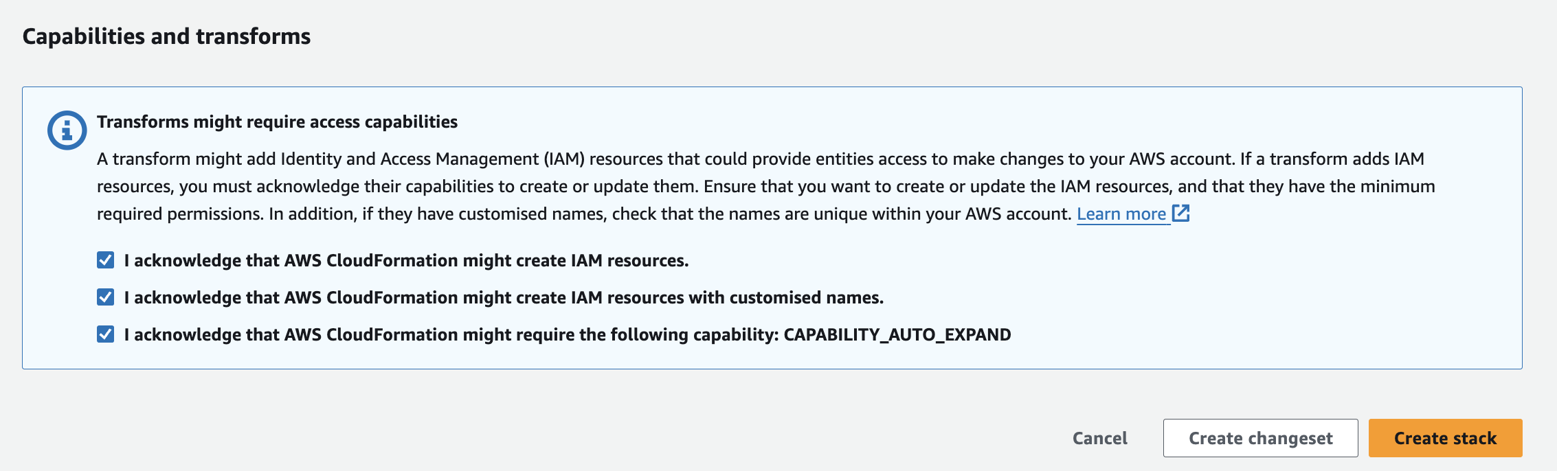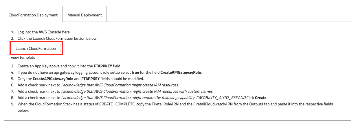 In FireTail, click Launch CloudFormation to launch the template. This opens in a new window.