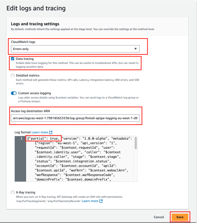 In the Access log destination ARN field, enter the ARN from the Outputs tab of the CloudFormation stack used to create the CloudWatch log group.