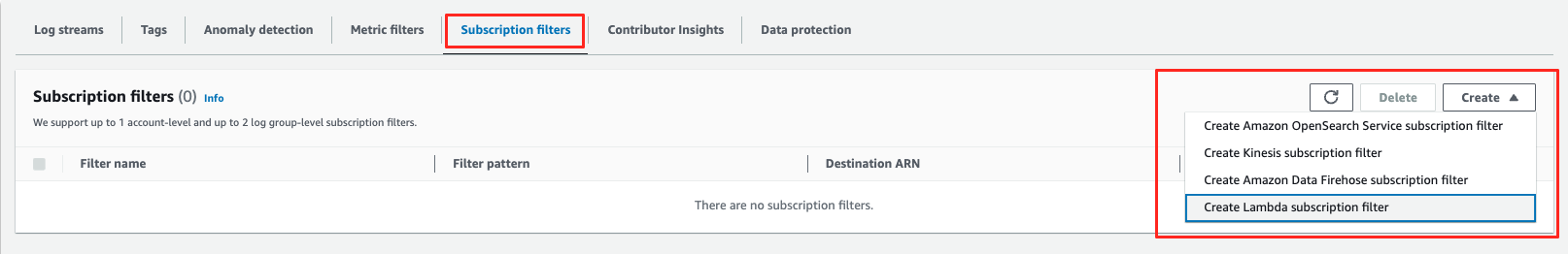 A subscription filter needs to be added to the Log group. Go to the Subscription filters tab. Click Create and select Create Lambda subscription filter.