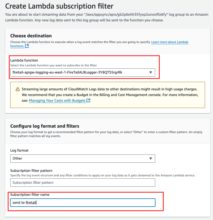Under Configure log format and filters, locate the Subscription filter name field enter a name in this field - (e.g., send to firetail).