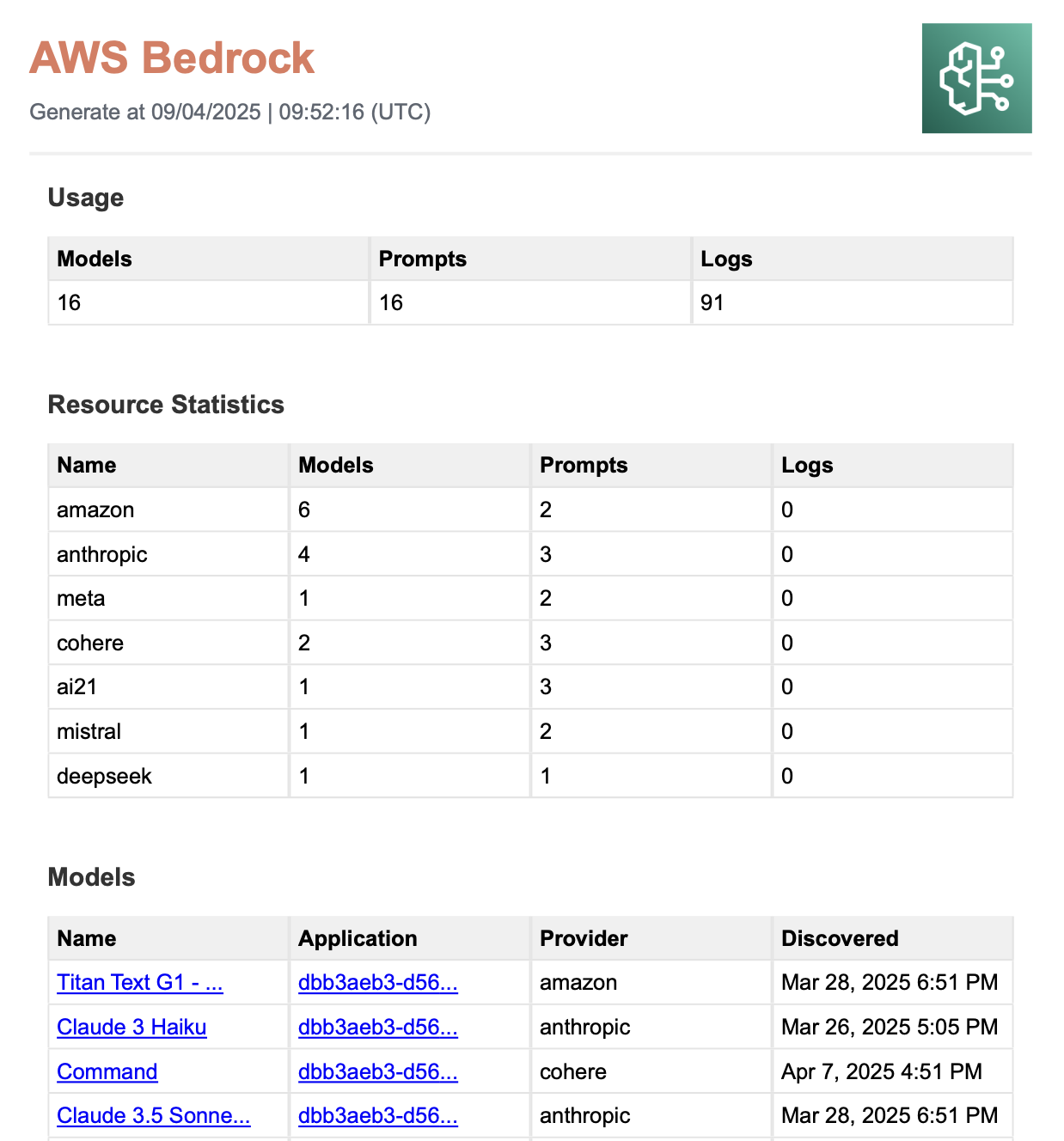 - Click AWS Bedrock Service Report to download a PDF version of the report.