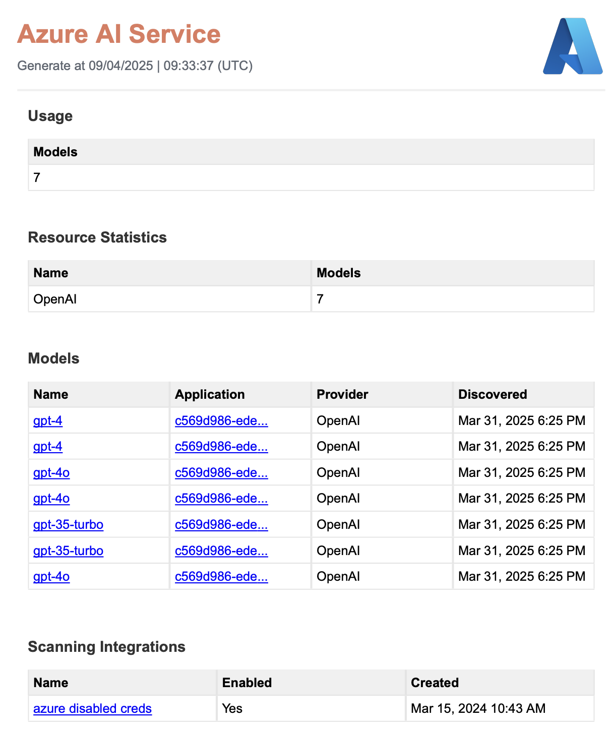 The Azure AI Service Report provides insights into the usage and activity of AI models, prompts, scanning integrations within Azure. The report is dynamically generated and includes real-time data from the past 90 days.