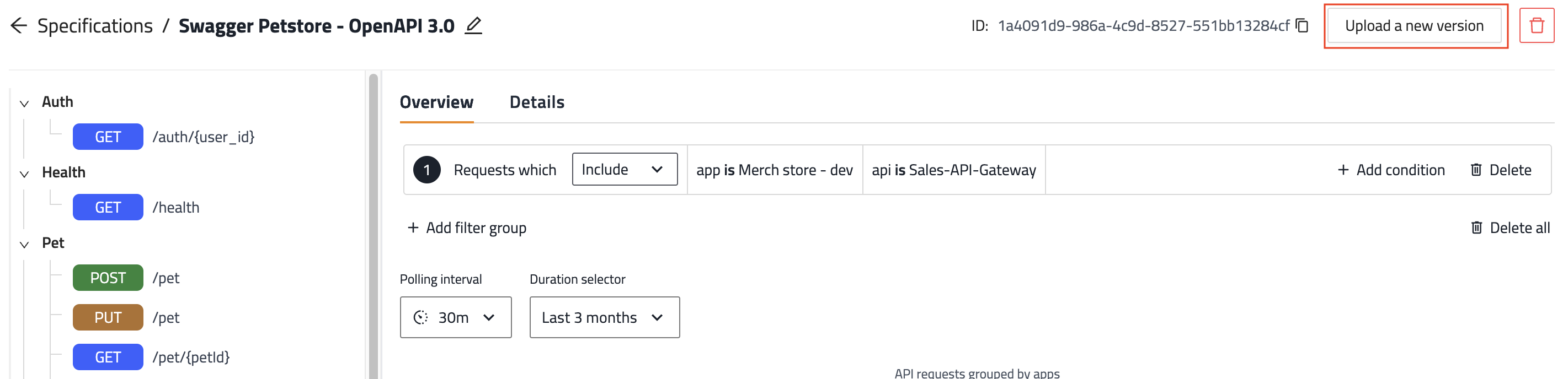 You can replace the existing version of a specification by uploading a new specification. The new version must be a .json or .yml file.